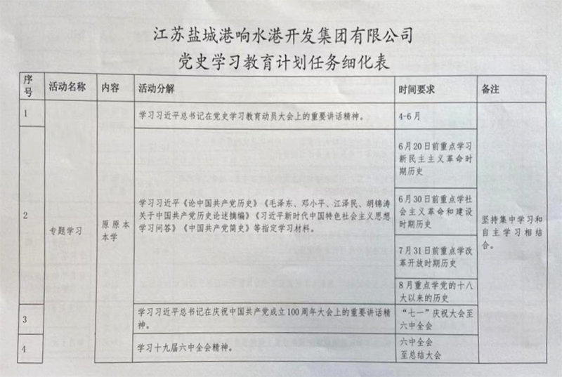 5月29日,響水港區(qū)在集中學習會上傳達學習了《響水港黨史學習教育計劃任務細化表》,向全體黨員和員工講知了細化任務。圍繞指定四本學習書籍,分期分段學習,做到有學習、有研討、有發(fā)言、有體會,讓黨史學習教育往深里走、往實里走,促使黨員干部進一步增強“四個意識”,堅定“四個自信”,做到“兩個維護”。