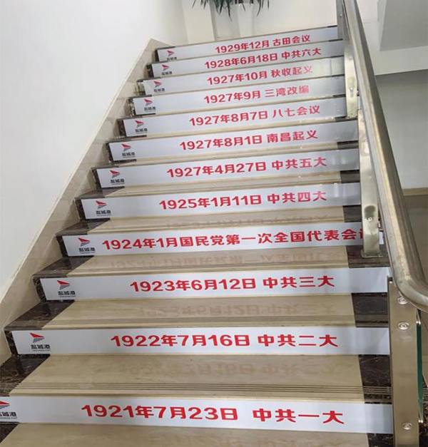針對廣大干部職工工作實際,響水港區(qū)精心設(shè)計,細心研究,將學習形式和載體不斷創(chuàng)新。近日,響水港區(qū)創(chuàng)新打造“樓梯課堂”,將黨史發(fā)展時間歷程貼印在樓梯上,方便大家在上班閑暇時,無形地將黨史知識學進腦子里。“樓梯課堂”的每一個階梯同時也代表著黨的每一個發(fā)展歷程,一步一臺階,扎扎實實譜新篇。響水港區(qū)員工普遍反映這個學習方式有創(chuàng)意有實效,鞏固加深了他們對黨史的掌握程度,也提高了他們學習黨史的興趣。