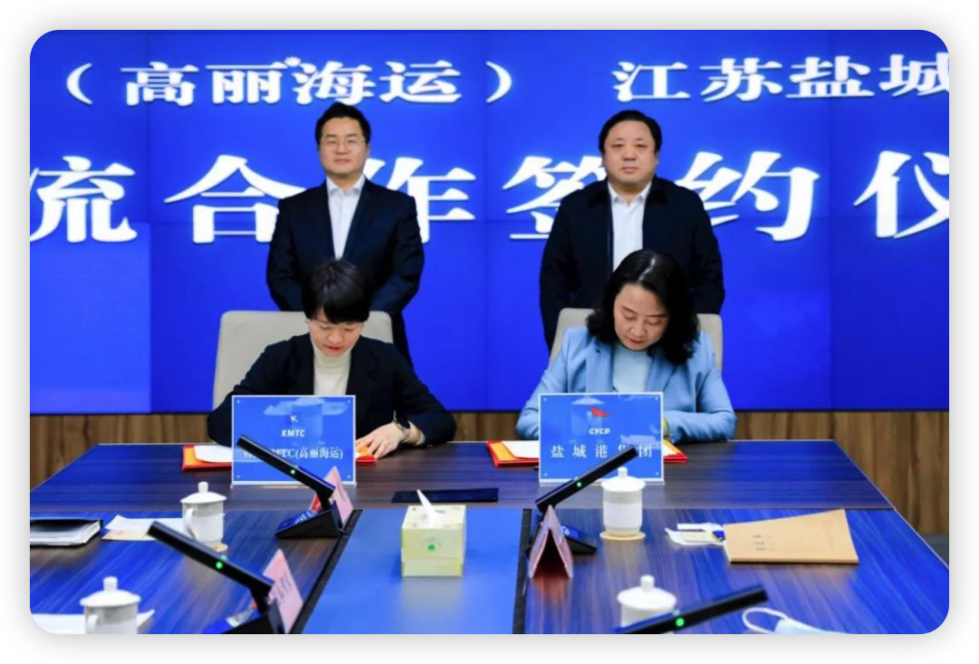 2月17日,江蘇鹽城港控股集團與韓國高麗海運 (KMTC)簽約儀式成功舉行。鹽城港集團黨委書記、董事長周正雄,高麗海運(上海)有限公司總經理李尚桓出席活動并鑒簽。鹽城港集團黨委副書記、董事、總經理陸帥等參加,鹽城港集團副總經理袁欣代表集團與高麗海運(上海)有限公司進行簽約。