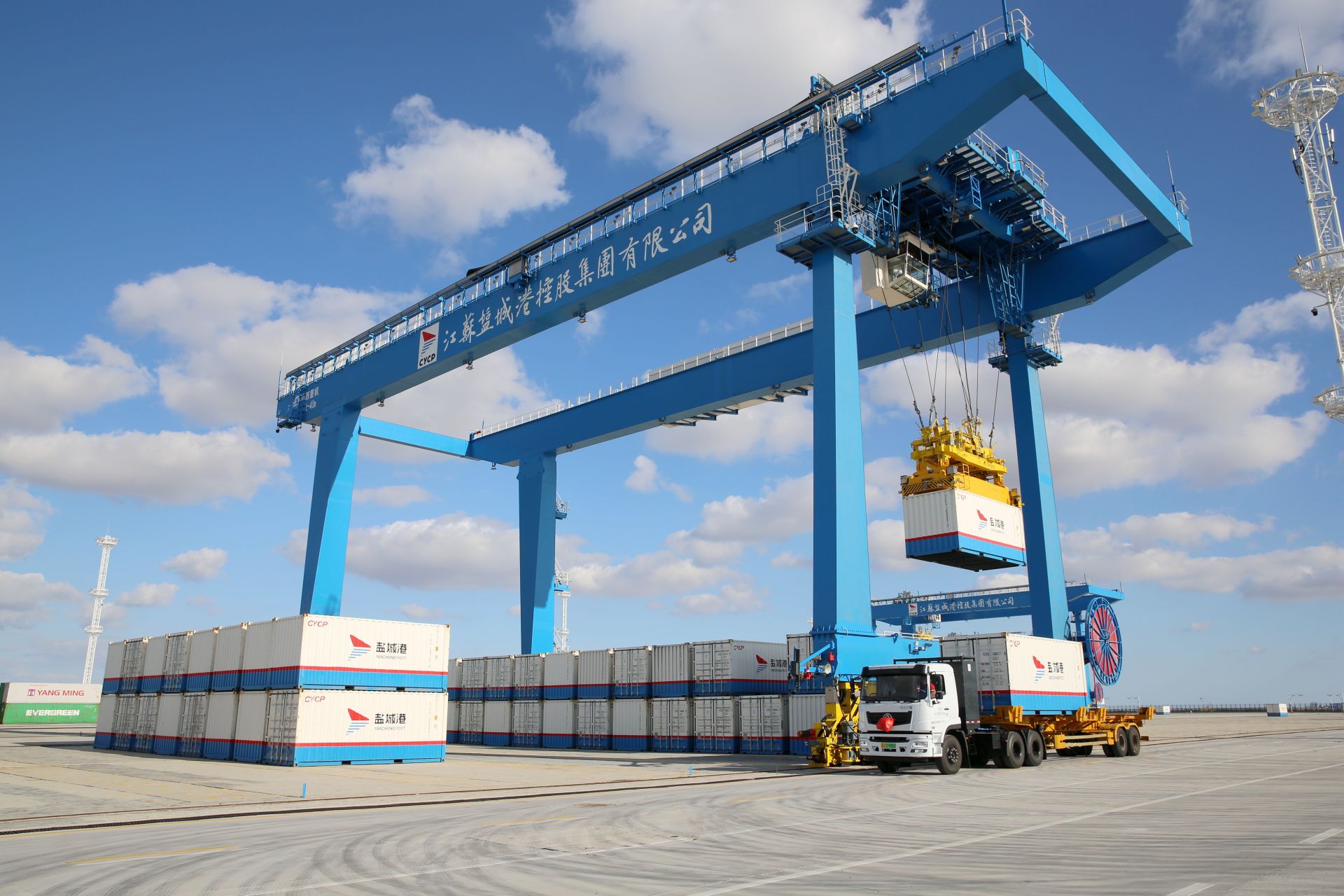 鹽城港自動化集裝箱堆場項目由江蘇鹽城港智慧港口有限公司投資建設,總投資4.5億元,綜合運用5G、自動化控制、北斗定位、數字孿生、智能一體化TOS(集裝箱操作系統)等先進技術,進行數字化、智能化、多維度融合,實現設備遠程控制、全過程設備調度一體化、生產作業現場無人化,年周轉集裝箱達100萬標箱。滿負荷生產運營后,預計可實現年營業收入1.4億元。