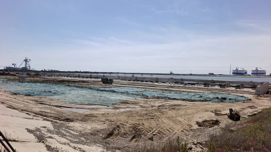 目前碼頭區(qū)域地連墻、灌注樁、高壓旋噴樁、錨碇梁、樁基、胸墻、鋼拉桿安裝已完成,現(xiàn)澆卸荷承臺(tái)完成92.8%,灌砌塊石完成86.9%。堆場(chǎng)部分原位固化、降水強(qiáng)夯、樁基已全部完成,6%水泥土已完成65%,排水溝完成29.2%,混凝土井完成86%,管道混凝土包封完成50.9%。