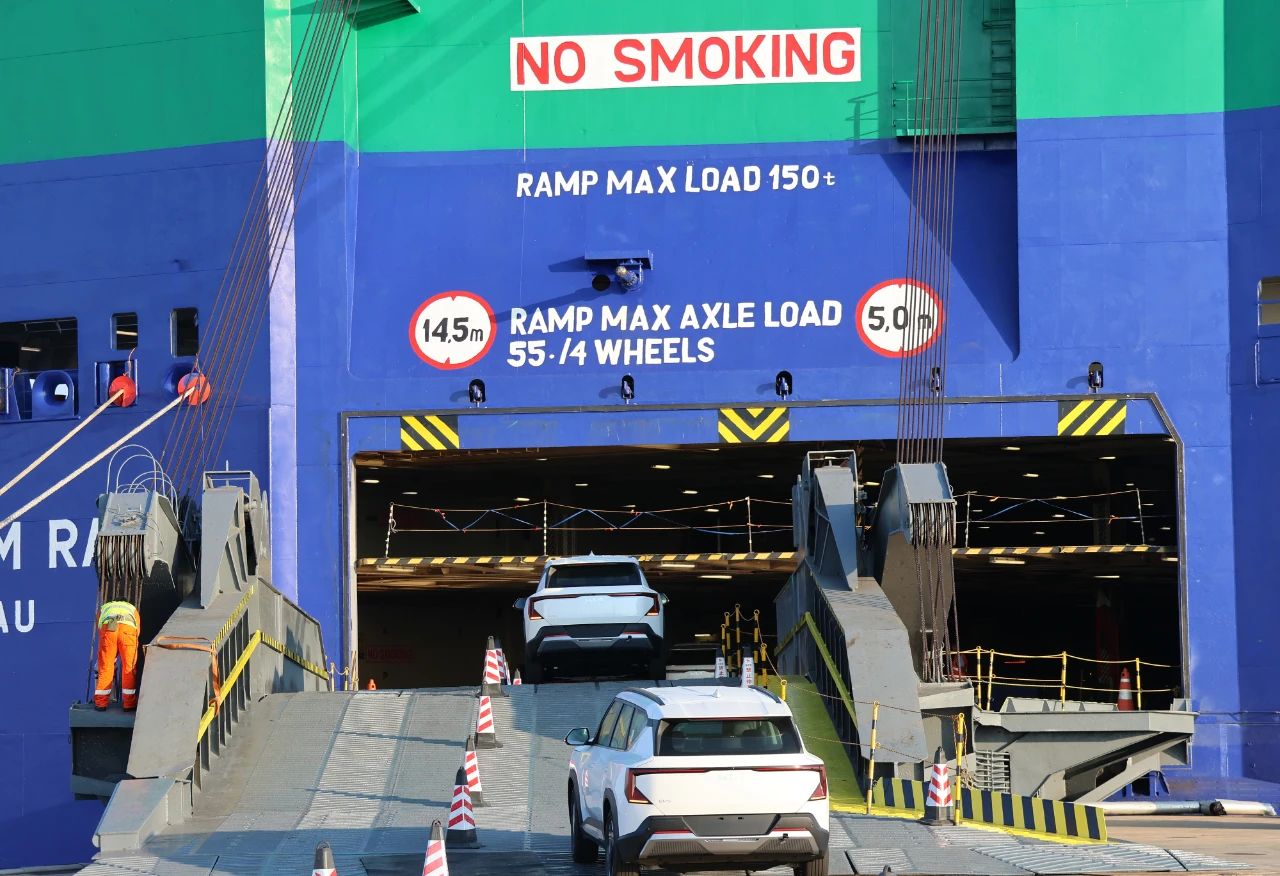 4179輛悅達(dá)起亞商品汽車駛過約2.5公里長的棧橋,到達(dá)集裝箱碼頭,最后登上貨輪,被穩(wěn)當(dāng)固定在多層貨架上。由于棧橋一期碼頭正在維修,只能半幅通車,因此共用此棧道的其他貨物運(yùn)輸停止作業(yè),為商品汽車通行讓道。