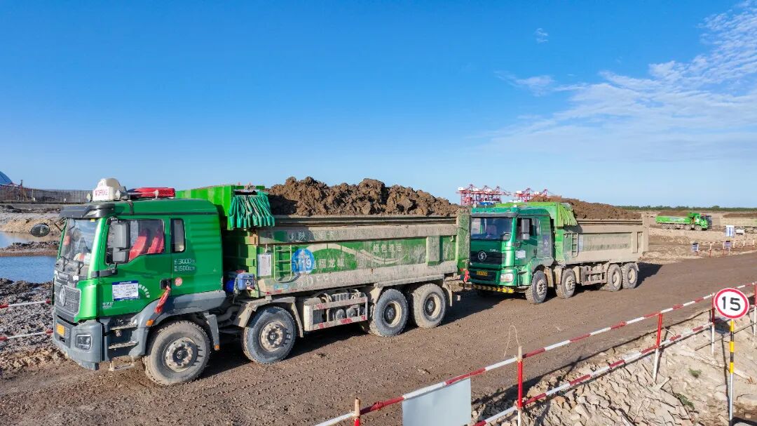 多臺挖掘機(jī)、運(yùn)輸車往來穿梭
