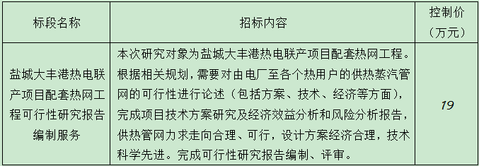 1.項(xiàng)目標(biāo)段劃分:鹽城大豐港熱電聯(lián)產(chǎn)項(xiàng)目配套熱網(wǎng)工程可行性研究報(bào)告編制服務(wù)共劃分1個(gè)標(biāo)段,標(biāo)段信息如下: