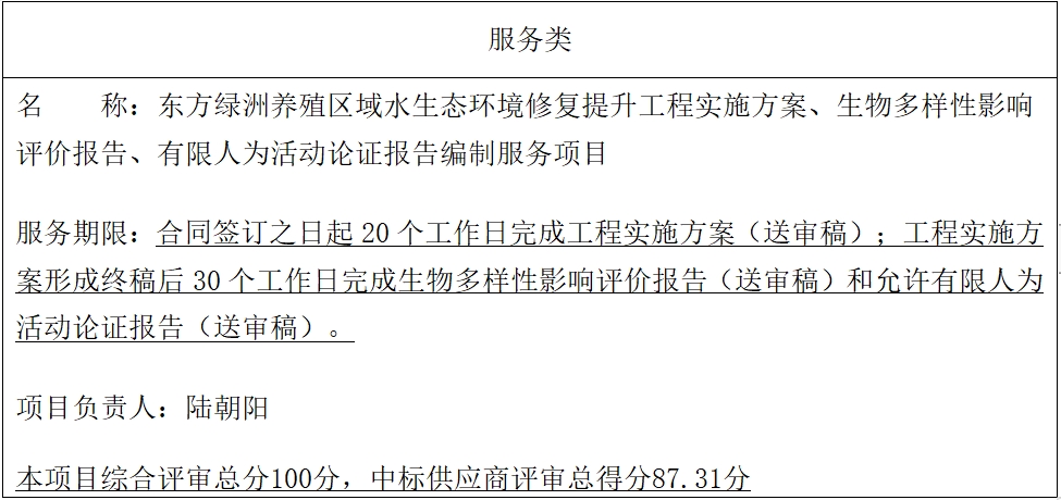 二、項(xiàng)目名稱:東方綠洲養(yǎng)殖區(qū)域水生態(tài)環(huán)境修復(fù)提升工程實(shí)施方案、生物多樣性影響評價報告、有限人為活動論證報告編制服務(wù)項(xiàng)目
