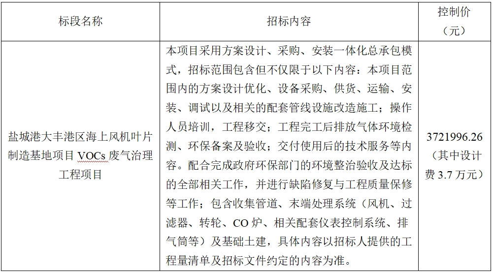 (5)項目標段劃分:鹽城港大豐港區(qū)海上風機葉片制造基地項目VOCs廢氣治理工程項目共劃分1個標段,標段信息如下: