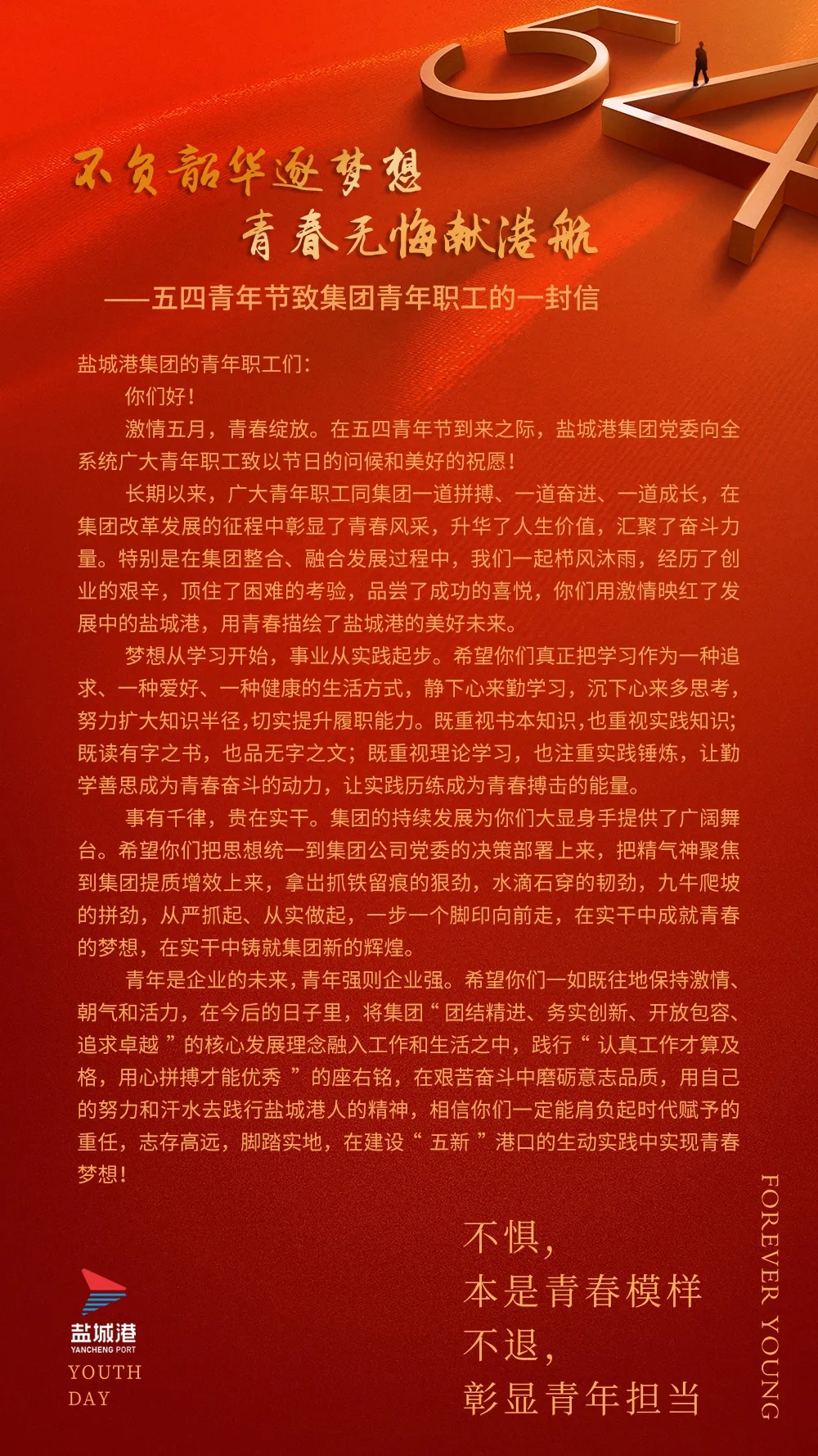火紅青春,激情五四。今年是紀念五四運動102周年,5月7日,鹽城港集團組織開展“五四”青年節紀念活動,持續推進黨史學習教育,匯聚青春正能量,激勵廣大青年干部在黨史學習教育中深刻感悟五四愛國精神,賡續使命、接續奮斗,為新時代港航事業貢獻青春之力。系統內各港區、各板塊、鹽城港引航站、機關各部門100余名青年同志參加。