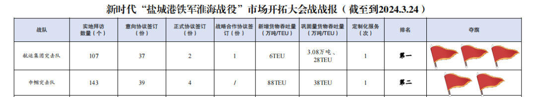 自新時(shí)代“鹽城港鐵軍淮海戰(zhàn)役”市場開拓大會(huì)戰(zhàn)開展以來,航運(yùn)集團(tuán)積極響應(yīng)鹽城港集團(tuán)黨委號召,成立航運(yùn)集團(tuán)突擊隊(duì)和巾幗突擊隊(duì),持續(xù)深化攬貨拓源,大力弘揚(yáng)“鐵軍精神”,成功實(shí)現(xiàn)市場開拓“新突破”,將定制化、兜底式服務(wù)推向了“新高度”。截至目前,累計(jì)拜訪客戶308家,簽訂意向協(xié)議97份,簽訂正式協(xié)議8份,實(shí)現(xiàn)新增營收超100萬元,集裝箱走量1008TEU。根據(jù)新時(shí)代“鹽城港鐵軍淮海戰(zhàn)役”指揮部第二期戰(zhàn)報(bào),航運(yùn)集團(tuán)包攬集體前兩名,個(gè)人前三名,全力打響“鹽城港鐵軍淮海戰(zhàn)役”市場開拓大會(huì)戰(zhàn)第一槍。