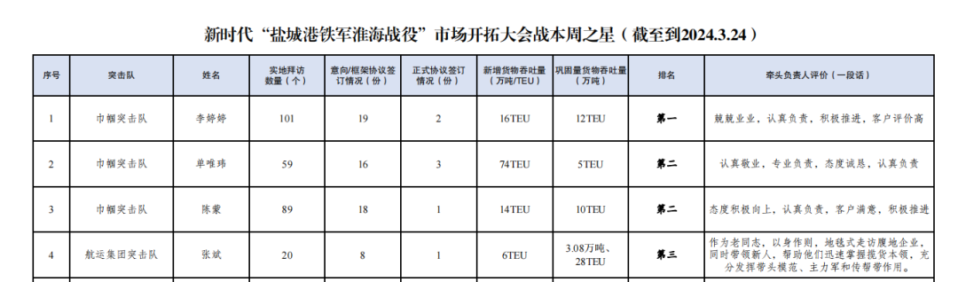 為確保新時(shí)代“鹽城港鐵軍淮海戰(zhàn)役”市場開拓大會(huì)戰(zhàn)取得實(shí)效,航運(yùn)集團(tuán)突擊隊(duì)和巾幗突擊隊(duì)堅(jiān)持“早晨會(huì)、晚匯報(bào)”工作機(jī)制,全面梳理腹地市場,明確目標(biāo)客戶群體,制定詳細(xì)的市場開拓計(jì)劃。同時(shí),強(qiáng)化攬貨人員培訓(xùn),以“戰(zhàn)功第一、全力以赴,令行禁止、使命必達(dá)”的要求,按照“我說你聽、你說我聽,我做你看、你做我看”老帶新模式,通過發(fā)放“流動(dòng)紅旗”并將“奔牛”“蝸牛”在當(dāng)月績效中予以體現(xiàn)的方式,“比學(xué)趕超,樹立典型”,進(jìn)一步發(fā)揮榜樣力量,不斷提升服務(wù)水平,以“軟實(shí)力”助推“硬發(fā)展”。