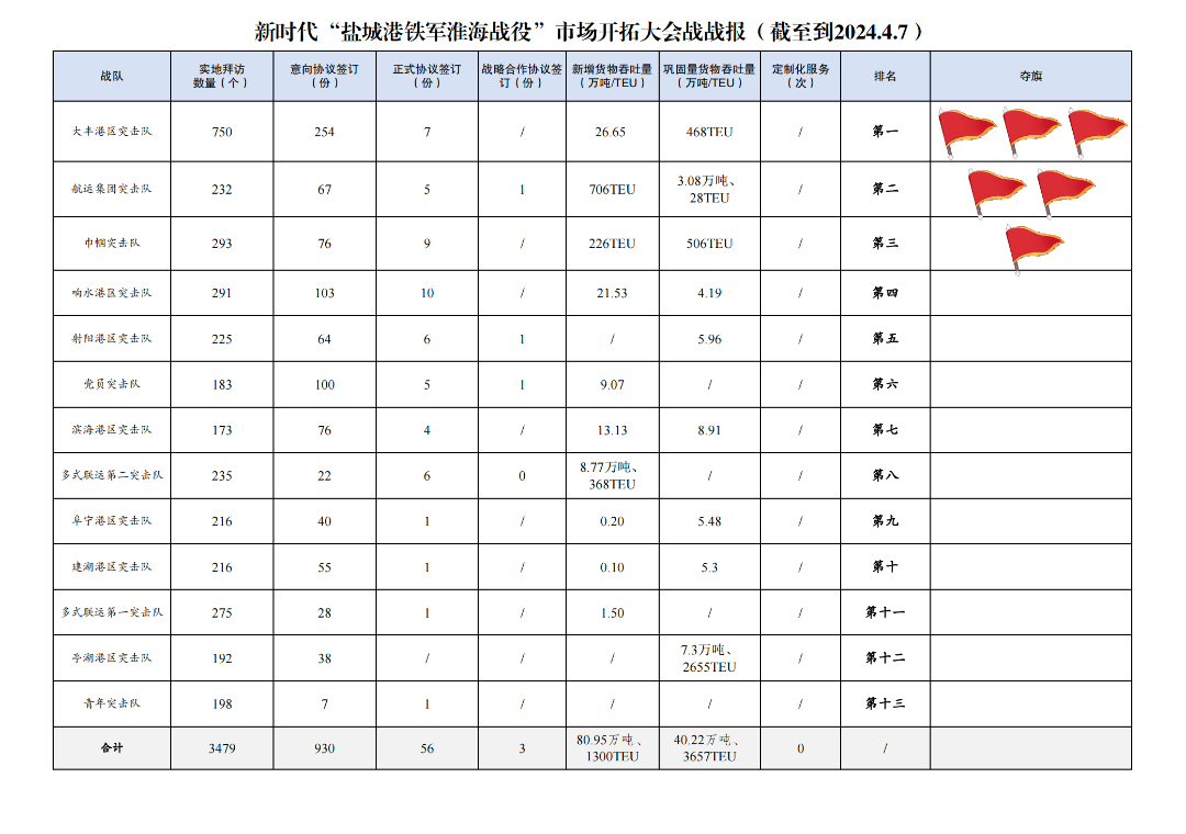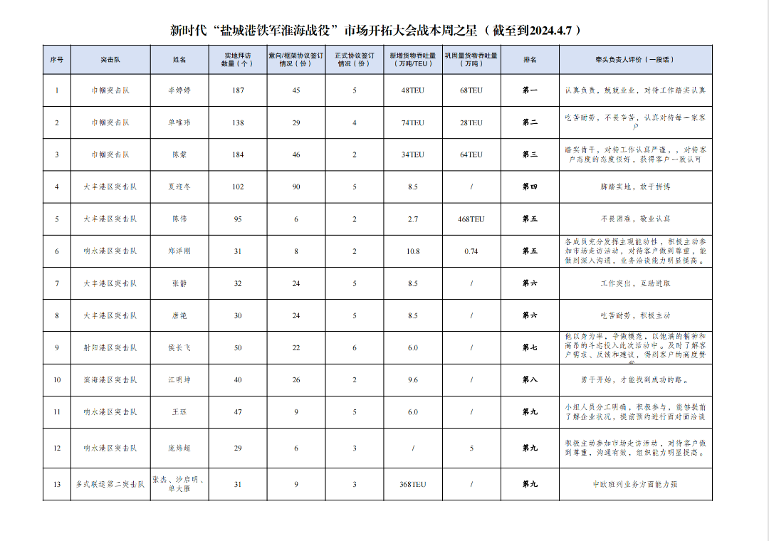 5.新增貨物吞吐量80.95萬噸、1300TEU:其中大豐港區突擊隊26.65萬噸,航運集團突擊隊706TEU,響水港區突擊隊21.53萬噸,多式聯運第二突擊隊8.77萬噸、368TEU,濱海港區突擊隊13.13萬噸,巾幗突擊隊226TEU,黨員突擊隊9.07萬噸,多式聯運第一突擊隊1.5萬噸,阜寧港區突擊隊0.2萬噸,建湖港區突擊隊0.1萬噸。