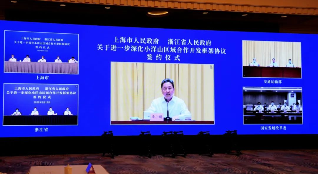 6月15日下午,上海市政府與浙江省政府以視頻連線方式正式簽署進一步深化小洋山區域合作開發框架協議。上海市委書記李強、浙江省委書記袁家軍和交通運輸部部長李小鵬、國家發展改革委副主任胡祖才出席簽約活動并講話。上海市委副書記、市長龔正,浙江省委副書記、省長王浩共同簽署協議。