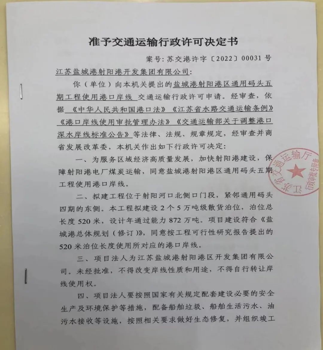 9月16日,鹽城港射陽港區通用碼頭五期工程岸線取得江蘇省交通運輸廳正式批復。截至目前,該項目前期工可報告、穩評、通航安全技術報告、防洪評價、岸線全部通過批復,這標志著項目開工正式邁入“快車道”。