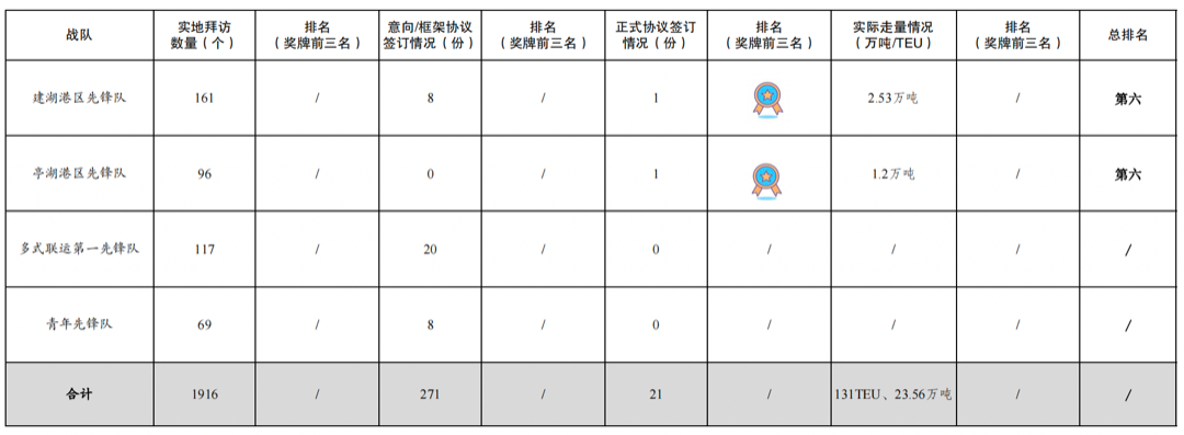 4.實(shí)際走量131TEU、23.56萬噸:其中黨員先鋒隊(duì)4.85萬噸,射陽港區(qū)先鋒隊(duì)4.32萬噸,響水港區(qū)先鋒隊(duì)3.84萬噸,航運(yùn)集團(tuán)先鋒隊(duì)2.79萬噸、86TEU,建湖港區(qū)先鋒隊(duì)2.53萬噸,阜寧港區(qū)先鋒隊(duì)1.8萬噸,大豐港區(qū)先鋒隊(duì)1.21萬噸,亭湖港區(qū)先鋒隊(duì)1.2萬噸,濱海港區(qū)先鋒隊(duì)1.02萬噸,巾幗先鋒隊(duì)45TEU。
