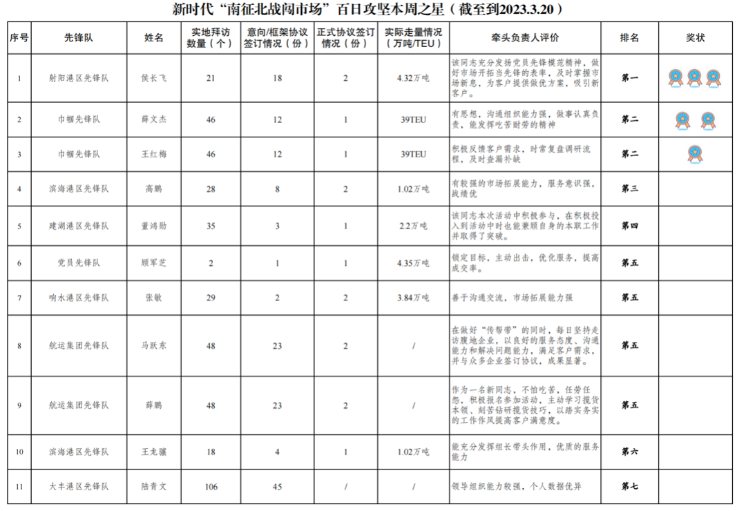 第一名:射陽先鋒隊(duì) 侯長飛(拜訪客戶21家,簽訂意向協(xié)議18份,簽訂正式協(xié)議2份,實(shí)際走量4.32萬噸)