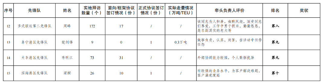 第一名:航運(yùn)集團(tuán)先鋒隊(duì) 馬躍東,射陽港區(qū)先鋒隊(duì) 侯長飛,濱海港區(qū)先鋒隊(duì) 高鵬,響水港區(qū)先鋒隊(duì) 張敏 2份