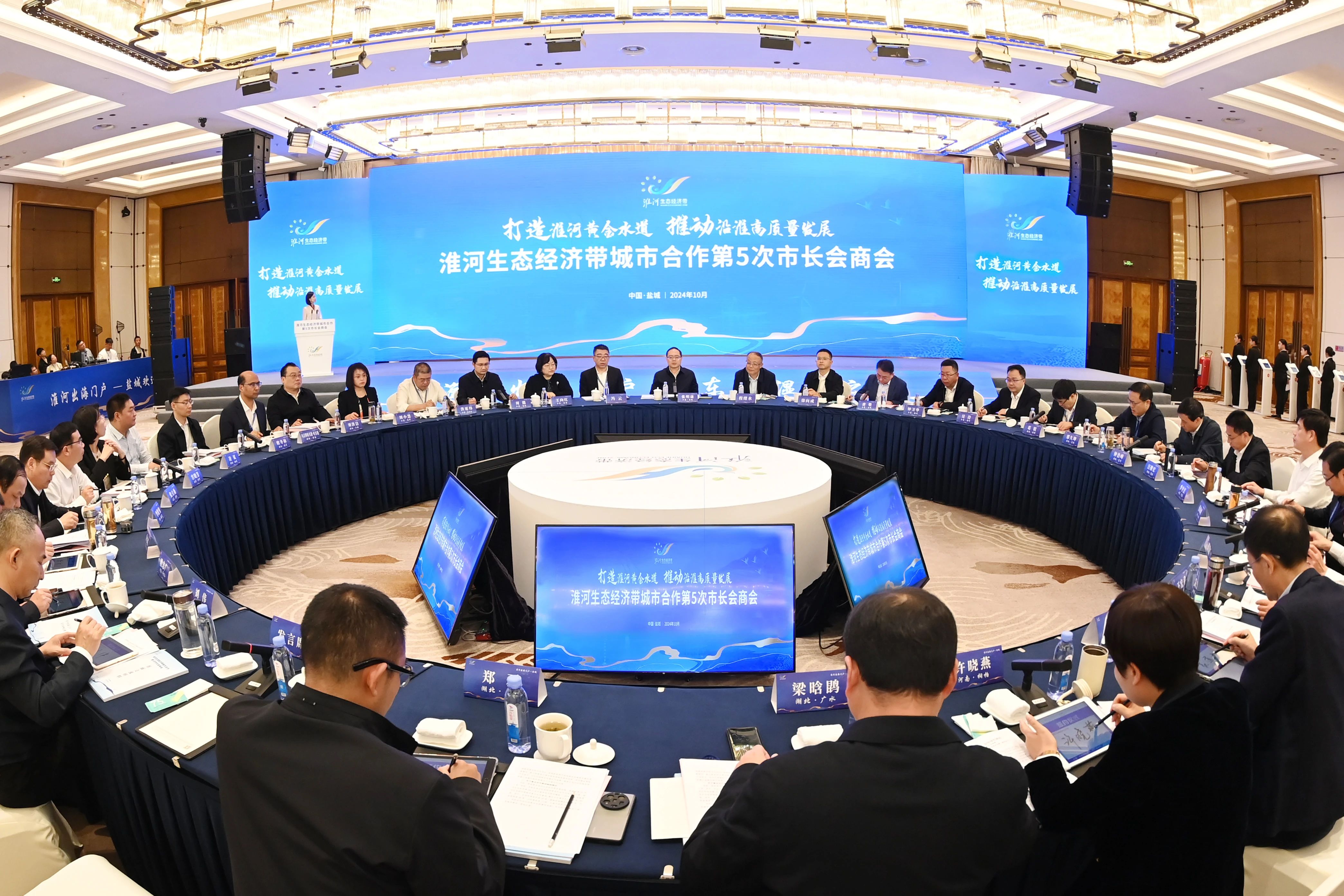 10月29日下午,淮河生態經濟帶城市合作第五次市長會商會在我市召開,沿淮5省29市(縣)負責同志齊聚鹽城,共敘淮水深厚情誼,共商發展合作大計。生態環境部淮河流域生態環境監督管理局、交通運輸部規劃研究院有關負責同志,29市(縣)有關部門負責同志以及沿淮主要港航、物流企業負責人參加會議。市委副書記、市長張明康主持會議。