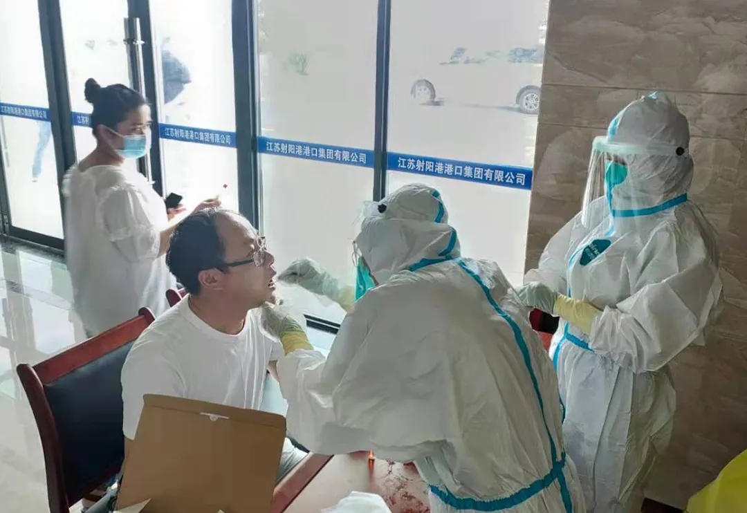 上午8時(shí),射陽縣疾病預(yù)防控制中心醫(yī)務(wù)人員就已經(jīng)準(zhǔn)備就緒,穿上防護(hù)服,戴好護(hù)目鏡、口罩、手套,在射陽港區(qū)聯(lián)檢樓核酸檢測點(diǎn)開始為港區(qū)員工進(jìn)行核酸檢測。現(xiàn)場人員有序排隊(duì),全程佩戴口罩,依次進(jìn)行檢測。截止中午12時(shí),港區(qū)近300名員工全部完成核酸檢測。