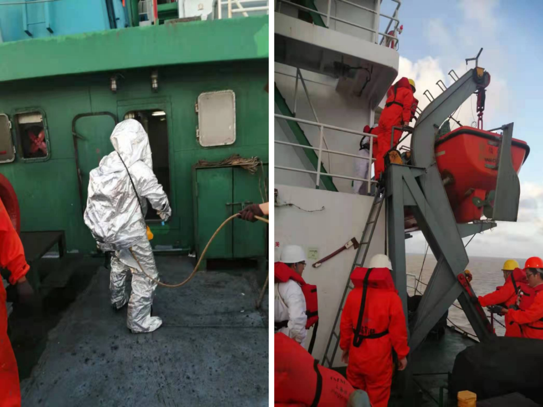 演習中,“申豐之花”輪按照既定演習方案,模擬船舶上層建筑起火,經過探火組探火、消防組降溫滅火、醫護組救助等一系列緊急有序的行動,實操演練了在船舶發生火情后的應急操作。在演練大火棄船過程中,全體船員穿著救生衣,攜帶防護服迅速前往集合點,在緊急情況下完成救生艇脫綁、人員登艇、遙控救生艇下降及救生艇回收等操作,順利完成棄船全過程演練。整個演練環節流暢,人員操作熟練,取得了較好效果,為冬季船員人身安全和船舶航行操作安全打下堅實基礎。