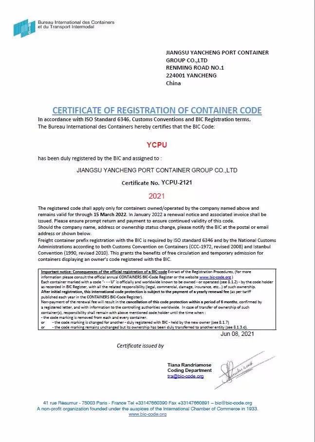 鹽城港集團(tuán)集裝箱自備箱全部獲得國際集裝箱局(法國)登記認(rèn)證,正式成為可以全球流通的集裝箱