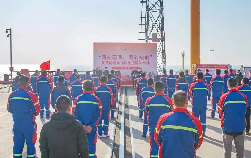 由大豐港區(qū)、航運(yùn)(集裝箱)集團(tuán)64名黨員組成的防疫先鋒隊(duì)支援碼頭一線