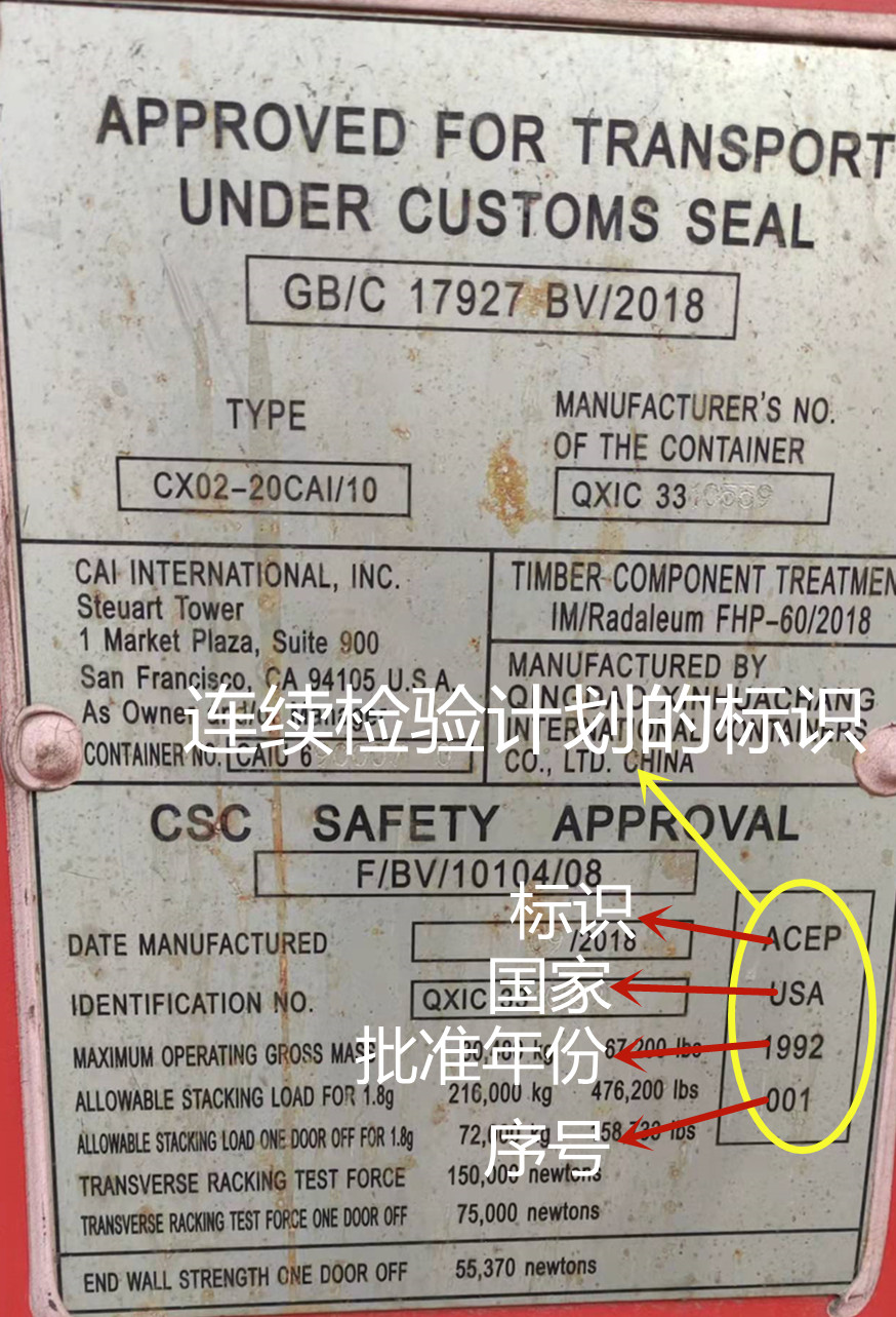 如此一來,即解決了龐大數(shù)量的集裝箱檢驗(yàn)的現(xiàn)實(shí)問題!?為表明集裝箱按經(jīng)批準(zhǔn)的連續(xù)檢驗(yàn)計劃( ACEP )運(yùn)行,須在安全合格銘牌上或盡可能靠近安全合格銘牌處,標(biāo)注字母 ACEP 和批準(zhǔn)該計劃的締約國的識別號。