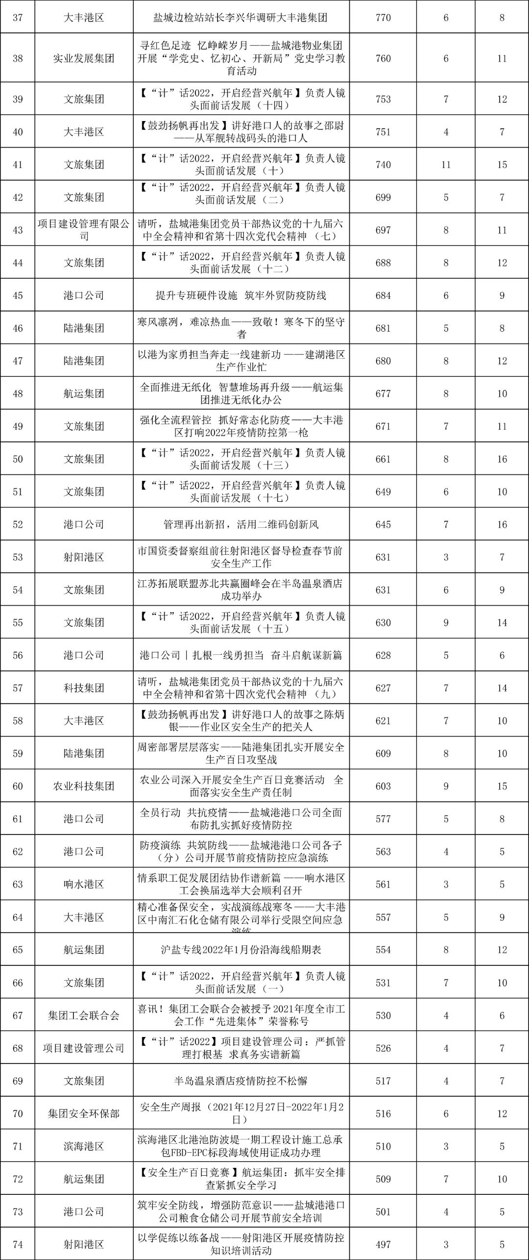 1月,“江蘇鹽城港控股集團”微信公眾號推送文章170篇,截至目前,閱讀總量14萬+,各單位供稿111篇。其中,文旅集團以2.1萬閱讀數,24篇稿件量,遙遙領先;大豐港區以1.8萬閱讀數,16篇稿件量,位列第二;港口公司、響水港區在供稿方面,以同樣13篇的數量并列第三,在閱讀量方面,港口公司以1.2萬的數量,位列單項第三;其他港口及板塊集團積極參與,踴躍投稿,情況較好。