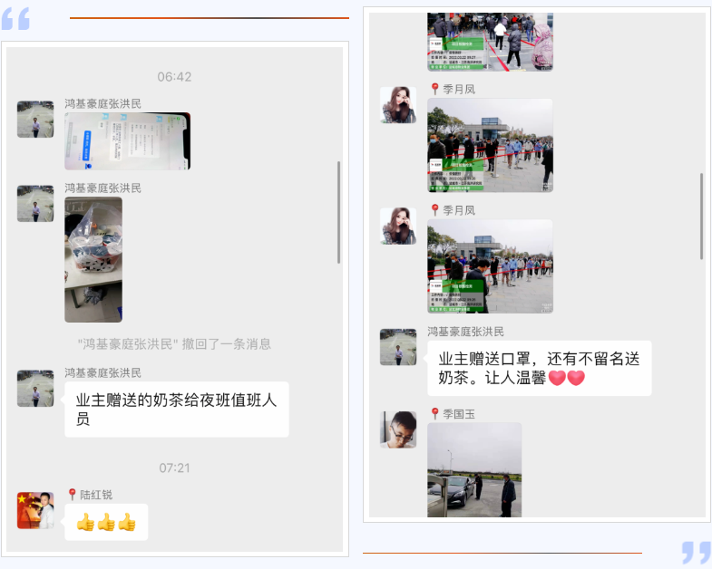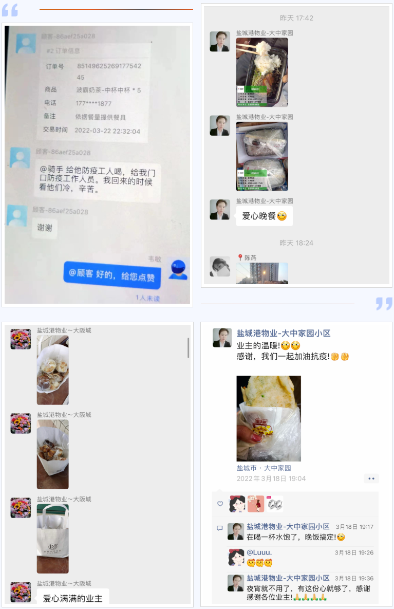 鹽城港物業人對防疫工作的責任與擔當,業主們看在眼里,暖在心里。有的自發捐助口罩、食品、暖寶寶,甚至牛奶、水果給值班“戰士”,讓戰斗在一線的物業人感到溫暖,聲聲感謝,是肯定,更是責任。他們時刻要面對疫情,在逆行中研究措施,在奔跑中調整姿勢。眾志成城、攻堅克難,防控疫情不松懈,這是一份植根鹽城港物業人內心的宣言。抗疫情、守平安,鹽城港物業人用實際行動共同守護著我們美麗的家園。