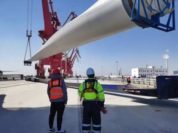 近日,隨著射陽港區(qū)第二班組指揮員的一句“好,可以往下繼續(xù)放”,自重40噸的大功率海上風(fēng)電葉片,從港區(qū)3.5萬噸級碼頭1號泊位平穩(wěn)吊放在振興5的船舶甲板。看著風(fēng)電葉片平穩(wěn)下落,現(xiàn)場作業(yè)人員都不由自主地鼓起掌來,這是港區(qū)首次自主成功裝卸單機(jī)葉片長度超過99米的7兆瓦風(fēng)電葉片,也正式標(biāo)志著射陽港區(qū)已完全具備自主裝卸大型風(fēng)電葉片的能力。