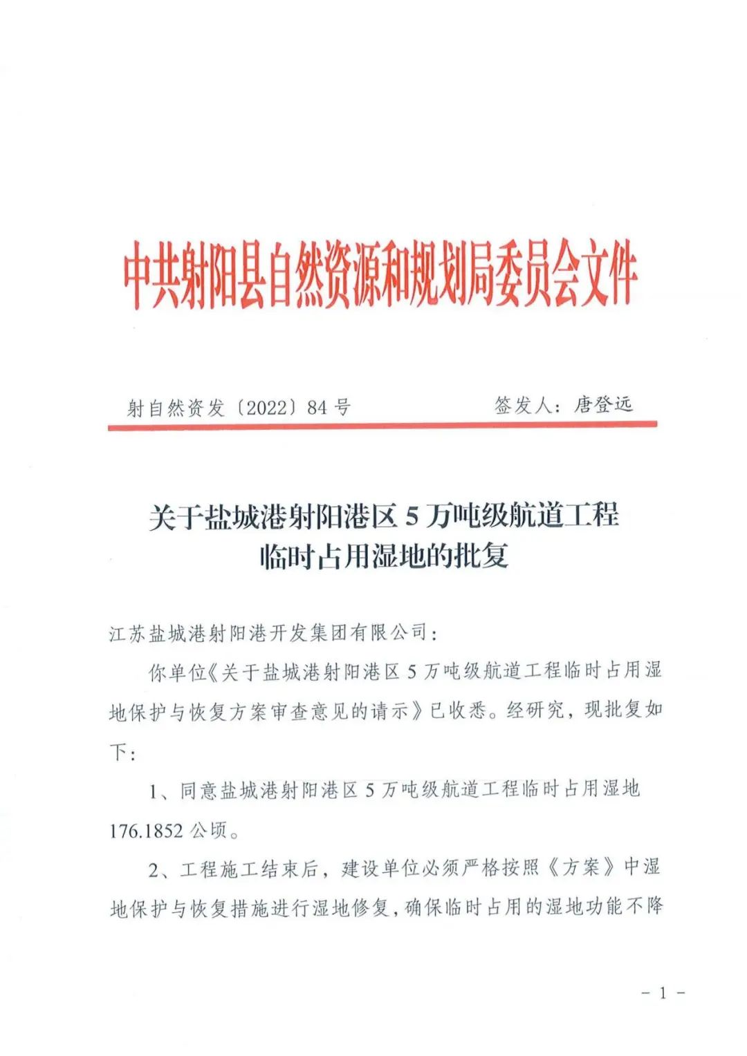 5月9日,鹽城港射陽港區(qū)5萬噸級航道工程臨時占用濕地取得縣自然資源和規(guī)劃局正式批復。至此,該項目已完成包括立項、通航評估、安全預評價等在內的十二項前期手續(xù),向項目的正式開工又邁進了堅實一步。