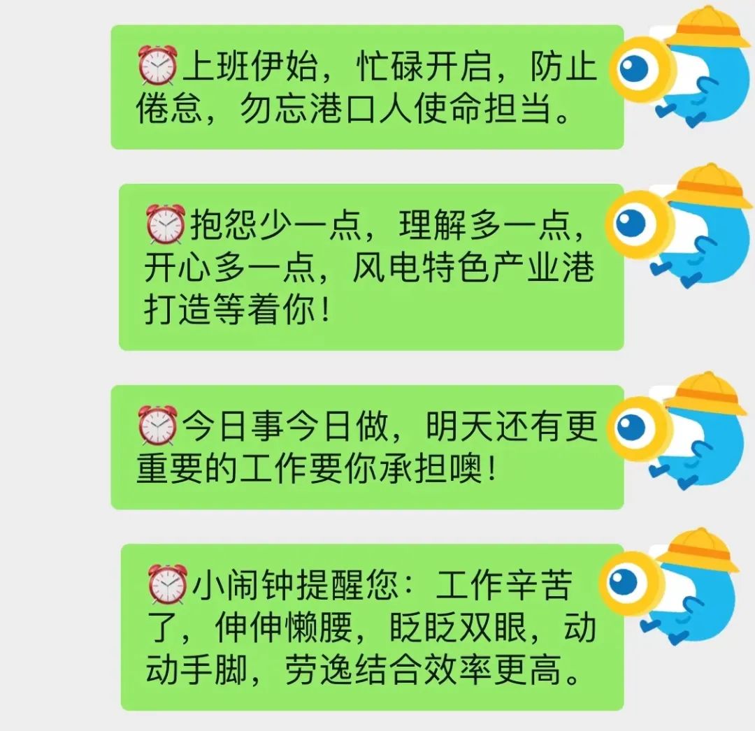 叮鈴鈴,“上班伊始,忙碌開啟,防止倦怠,勿忘港口人使命擔(dān)當(dāng)?!泵刻煲簧习?,打開電腦,首先彈出上述信息。這是射陽(yáng)港區(qū)新增設(shè)的辦公“鬧鐘小貼士”的管家信息。提醒各位員工,作為鹽城港人,要時(shí)刻不忘肩負(fù)的“架起鹽城走向世界海上大通道”時(shí)代使命,必須時(shí)刻保持永不懈怠、奮發(fā)拼搏的精神狀態(tài),做好自己的本職工作。