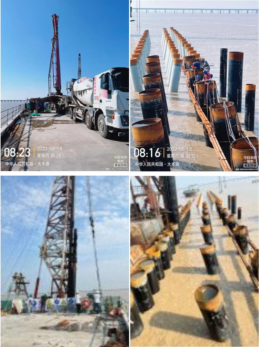 圖三、圖四:東堤B段第七分段最后一根鋼管樁打樁施工。