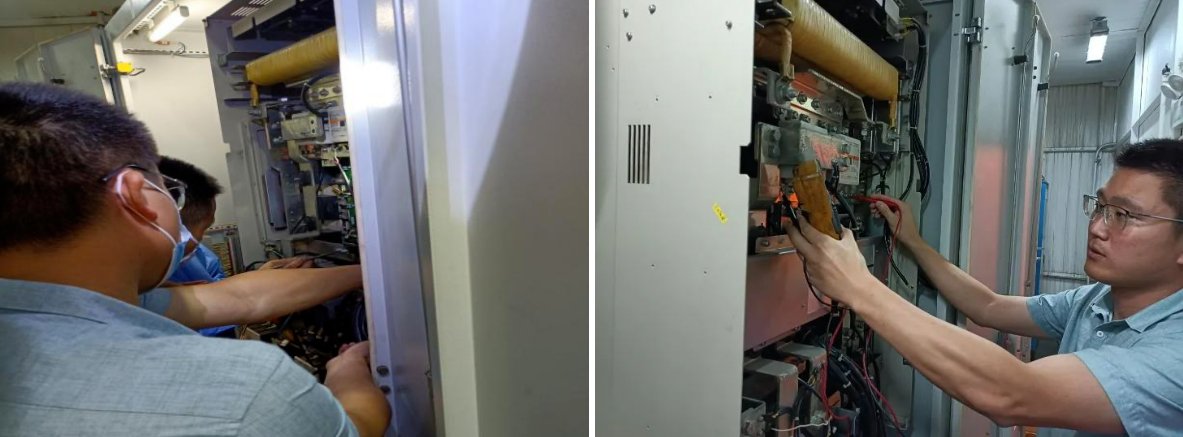 更換備件后,進(jìn)行上電檢測(cè),發(fā)現(xiàn)設(shè)備仍無法正常工作。維修團(tuán)隊(duì)又繼續(xù)排查外部元器件,發(fā)現(xiàn)變頻柜主電源空氣斷路器、主電源接觸器的觸頭燒蝕。為空氣斷路器更換元器件后,又對(duì)設(shè)備反復(fù)進(jìn)行上電測(cè)試,維修團(tuán)隊(duì)持續(xù)奮戰(zhàn)到29日凌晨3點(diǎn),直至試機(jī)正常。