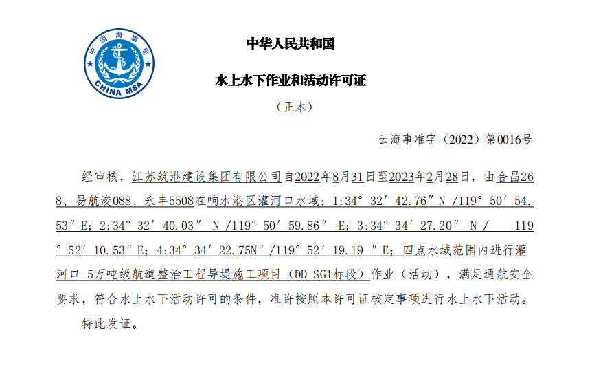 8月初,導堤工程項目施工單位網上申報水上水下活動許可,在連云港海事局受理后,響水港區和項目管理公司通力合作,主動靠前與施工單位對接協調施工船舶到港事項,共同推動施工船舶查驗工作開展,為灌河口5萬噸級航道整治工程導堤施工項目獲批水上水下活動許可證奠定了堅實基礎。