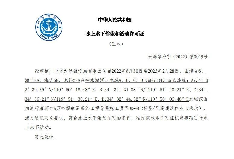 8月30日至31日,連云港海事局陸續簽發灌河口5萬噸級航道整治工程導堤施工一標段和二標段水上水下活動許可證,標志導堤工程施工前手續全部完成,為灌河口5萬噸級航道整治工程的全面開展邁出了重要一步。