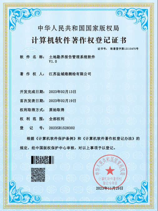 鹽城港港航勘測設(shè)計(jì)公司一直高度重視技術(shù)發(fā)展創(chuàng)新和知識產(chǎn)權(quán)保護(hù),現(xiàn)已獲得測繪OA綜合管理系統(tǒng)軟件、地形測量數(shù)據(jù)處理與繪圖成圖系統(tǒng)、航空攝影測量數(shù)據(jù)采集軟件、三維建模數(shù)據(jù)處理和信息管理軟件、土地勘界報(bào)告管理系統(tǒng)軟件五項(xiàng)軟件著作權(quán)。