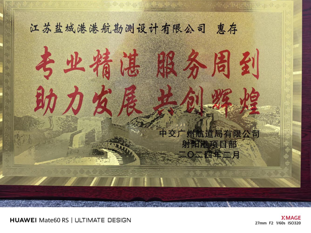 近期,鹽城港港航勘測設計有限公司收到來自中交廣州航道局有限公司贈送的牌匾,以此感謝我單位在《鹽城港射陽港區3.5萬噸級航道維護疏浚工程(二期)施工項目HD-SG2標段》項目建設中精心測繪、主動靠前服務,為他們這次施工方案、組織優化提供了精準的數據。