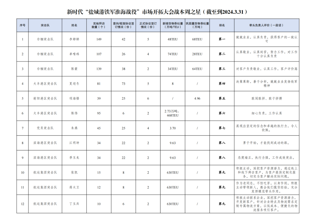 第一名:巾幗突擊隊 李婷婷(拜訪客戶149家,簽訂意向協(xié)議42份,簽訂正式協(xié)議5份,新增貨物吞吐量48TEU,鞏固量貨物吞吐量68TEU)