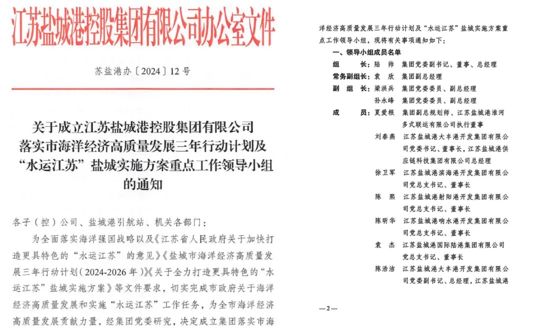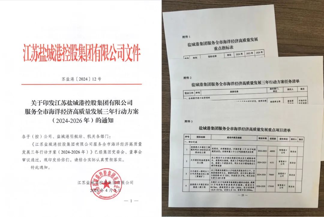 2月3日,集團發(fā)布了《關(guān)于成立江蘇鹽城港控股集團有限公司落實市海洋經(jīng)濟高質(zhì)量發(fā)展三年行動計劃及“水運江蘇”鹽城實施方案重點工作領(lǐng)導小組的通知》,領(lǐng)導小組下設(shè)一辦兩組,明確各項工作責任單位和責任人。3月2日,工作領(lǐng)導小組召開第一次調(diào)度會議,對各項工作進行了系統(tǒng)部署,深入推進海洋經(jīng)濟高質(zhì)量發(fā)展和水運江蘇重點工作。