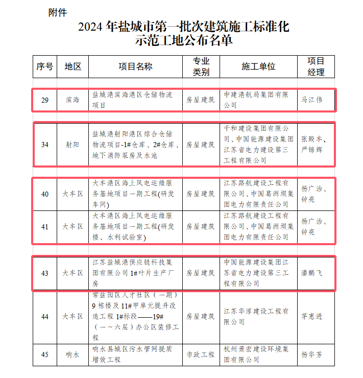 近日,市住房和城鄉(xiāng)建設局公布了2024年第一批次鹽城市建筑施工標準化示范工地項目名單,江蘇鹽城港項目管理咨詢有限公司代管項目:鹽城港濱海港區(qū)倉儲物流項目,鹽城港射陽港區(qū)綜合倉儲物流項目1#倉庫、2#倉庫、地下消防泵房及水池,大豐港區(qū)海上風電運維服務基地項目一期工程(研發(fā)車間、研發(fā)樓、水利試驗室),大豐港區(qū)海上風機葉片制造基地項目(一期)項目獲評2024年第一批次鹽城市建筑施工標準化“示范工地”。