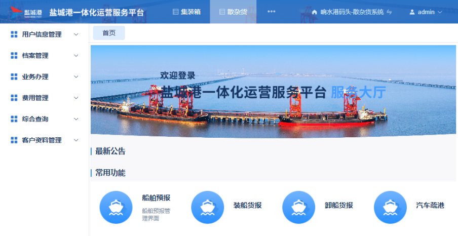 鹽城港網上營業廳響水港散雜貨模塊的上線,不僅優化了港口的業務流程,同時實現了信息的實時共享和透明化管理。客戶可以通過網上營業廳輕松查詢貨物狀態,辦理包括船舶備案、船舶預報、船舶報港、汽車報港等在內的相關手續,大幅縮短了業務辦理時間,提高了工作效率。