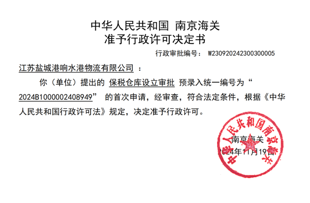 經過一系列申報、審批流程,響水港物流有限公司公用型保稅倉成功獲得南京海關的行政許可,并于12月2日下發行政許可決定書。標志著響水地區首個“公用型保稅倉庫”正式批準設立。