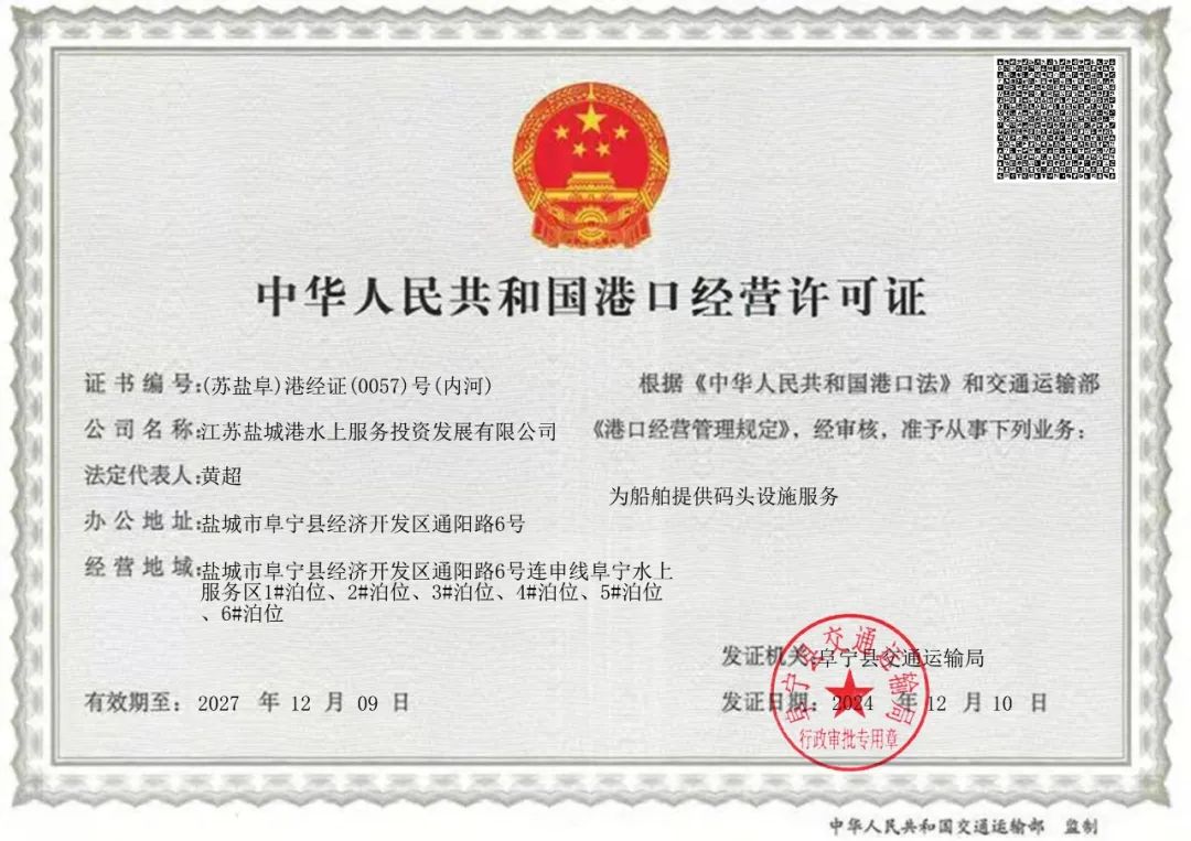 數(shù)月來,經(jīng)過交通部門現(xiàn)場指導(dǎo),對照清單要求,水上服務(wù)公司工作專班第一時間匯總遞交各類辦證資料,先后完成環(huán)評、安評、安全應(yīng)急預(yù)案、沉降檢測等項目。水上服務(wù)區(qū)高質(zhì)量完成設(shè)計批復(fù)的工程內(nèi)容,驗收資料齊全,滿足竣工驗收條件,碼頭項目順利通過竣工驗收,并于12月9日順利取得《中華人民共和國港口經(jīng)營許可證》,獲準(zhǔn)水上服務(wù)公司從事為船舶提供碼頭設(shè)施服務(wù)。