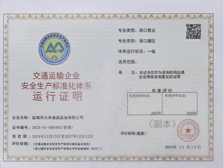 近日,鹽城港大豐港區成品油公司順利取得“通運輸企業安全生產一級標準化證書”,標志著成品油公司在安全生產管理體系精細化、規范化、標準化建設上實現了提質升級。