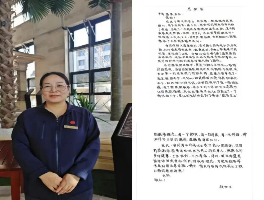 在港泊半島酒店,暖心的故事每天都在上演。近日,酒店收到了一封來(lái)自溫泉館客人的感謝信。信中,客人用真摯的筆觸,對(duì)溫泉館員工吳月華的服務(wù)賦予了極高的評(píng)價(jià)。為了弘揚(yáng)這種敬業(yè)精神,樹(shù)立酒店服務(wù)的全新標(biāo)桿,港泊半島酒店開(kāi)展了向優(yōu)秀榜樣吳月華學(xué)習(xí)的活動(dòng)。每一位員工都積極響應(yīng),將熱忱融入日常服務(wù)的每一處。他們以實(shí)際行動(dòng)詮釋著五星級(jí)酒店的品質(zhì)與擔(dān)當(dāng),致力于為每一位賓客打造更加優(yōu)質(zhì)、貼心、溫暖的入住體驗(yàn),用心雕琢著港泊半島酒店的卓越口碑。