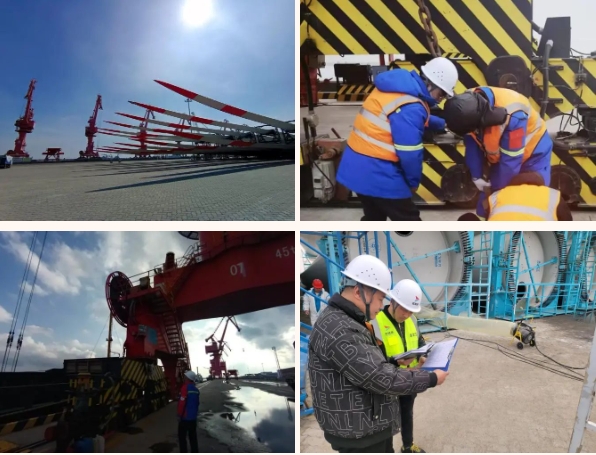 乍暖還寒的天氣,掩不住悄然開放的迎春花香漫過大件堆場,95后的巡查員正在研判著123米葉片堆碼安全間距。“前端對齊,仰角30°,符合要求,可以落鉤”,他和現場安全員溝通的聲音驚飛了棲息在高桿燈防撞桿上的白鷺;500米外的消防泵站檢修現場,消防維保員踩著管道內清理出的沒過雨靴的淤泥,“通了、通了”興奮的高聲喊叫。