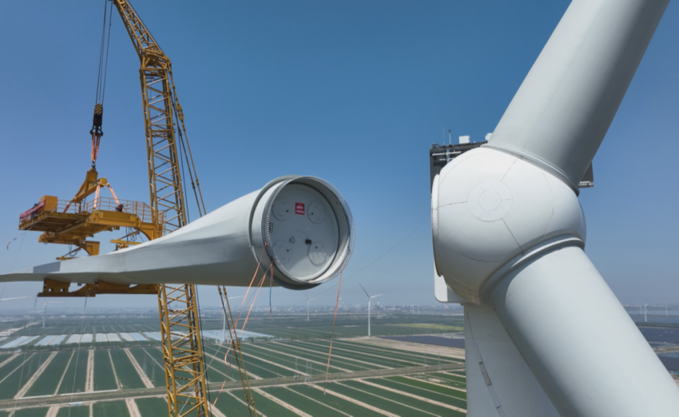 據了解,本次吊裝的風力發電機組輪轂中心高155米,相當于50多層大樓的高度,單支葉片長130米,葉輪直徑266米,掃風面積約5.55萬平方米,接近8個足球場面積之和。相較于以往風電設備,該機組滿負荷狀態下每小時發電量高達16200度,每年發電量可滿足17萬家庭全年用電,單機發電能力提升3.2倍,極大提升了優質風能資源和土地利用效率。該機組推廣使用后將產生大量清潔電能,優化能源結構,為經濟社會可持續發展提供綠色動力。