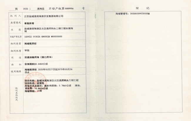 此次海域使用證的獲批,標志著濱海港區(qū)北區(qū)通用碼頭三期工程在建設進程中邁出了堅實一步,也為鹽城港的發(fā)展注入了新活力,助力其在區(qū)域經濟發(fā)展中發(fā)揮更大作用。