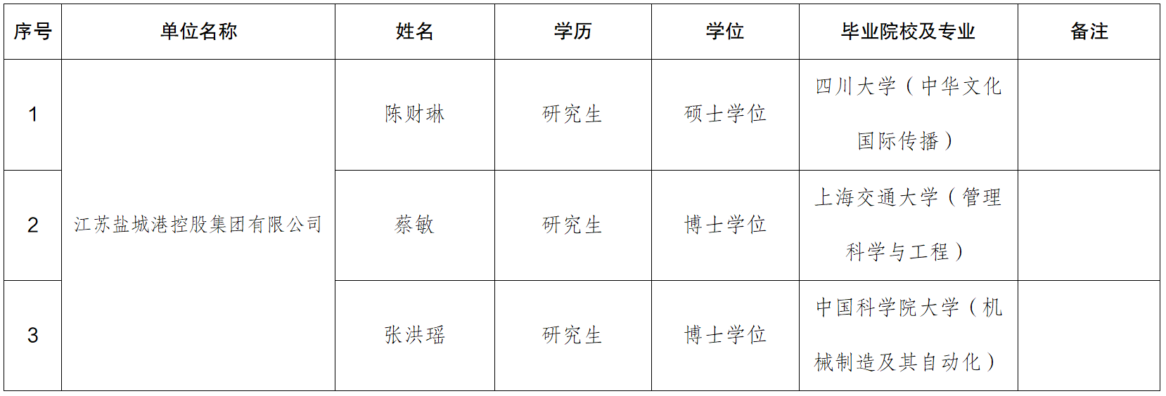 2022年鹽城市第一批面向全國部分高校和 境外世界名校引進優秀畢業生鹽城港集團擬聘用人員名單公示(三)