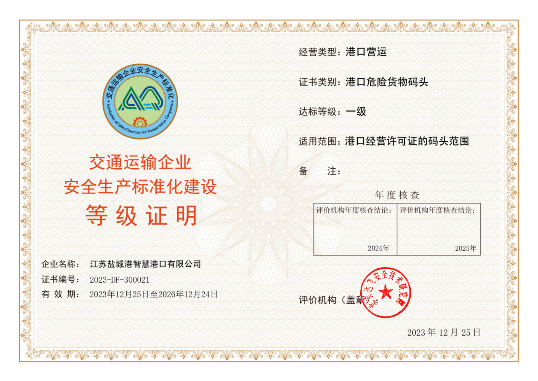 近日,江蘇鹽城港智慧港口公司順利通過交通運輸企業安全生產標準化達標認證考核,喜獲“交通運輸企業安全生產標準化建設一級證書”,標志著智慧港口公司安全生產管理體系精細化、規范化、標準化建設邁上新臺階。