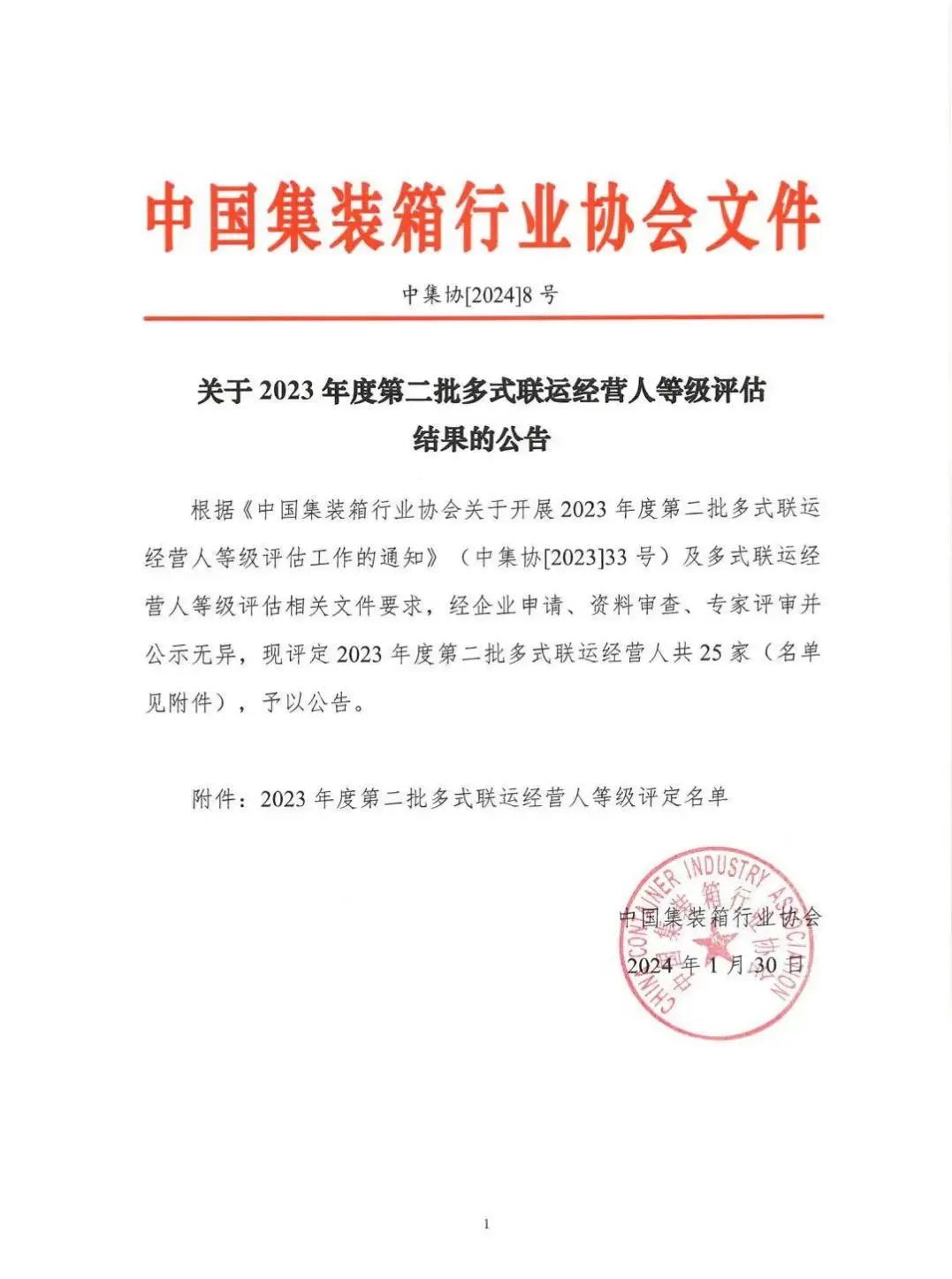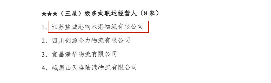 近日,中國集裝箱行業(yè)協(xié)會發(fā)布2023年度第二批多式聯(lián)運經(jīng)營人等級評定名單,江蘇鹽城港響水港物流有限公司獲得“三星級多式聯(lián)運經(jīng)營人”稱號。
